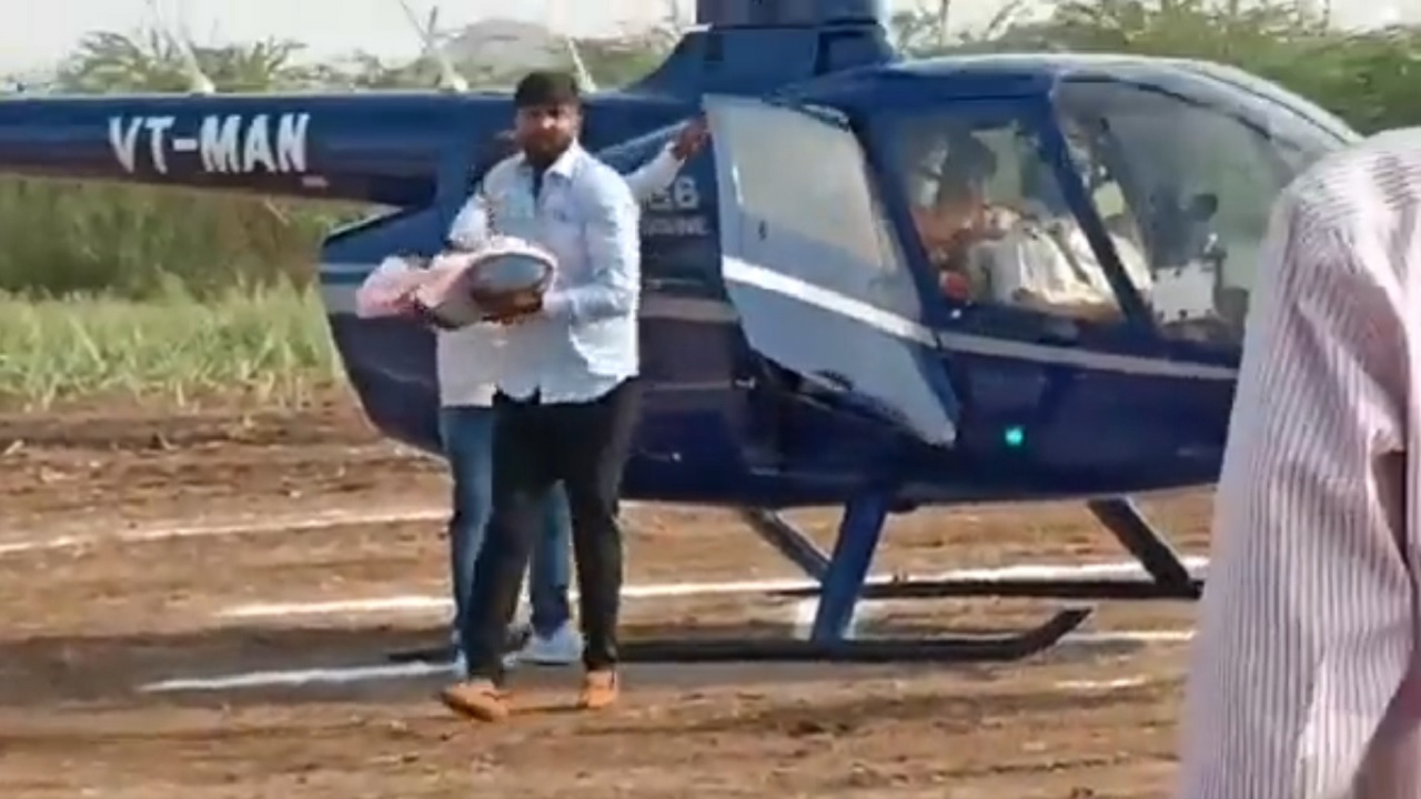 #WATCH Shelgaon, Pune | Grand Homecoming ! A family brought their newborn girlchild in a chopper
