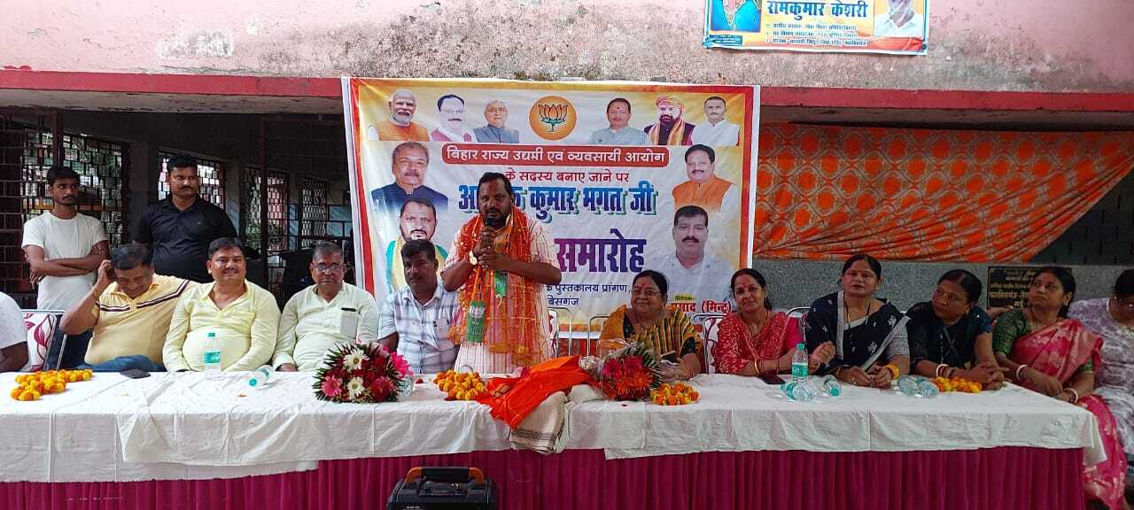 फारबिसगंज. आलोक भगत को बिहार राज्य उधमी व व्यवसायिक आयोग के सदस्य बनने पर स्थानीय रेणु सार्वजनिक पुस्तकालय परिसर में सोमवार को सम्मान समारोह आयोजित किया गया. जिसमें नव मनोनीत सदस्य सह भाजपा नेता आलोक भगत का भव्य स्वागत किया गया. मौके पर वक्ताओं ने आलोक भगत को बधाई देते हुए व्यवसायियों को हो रही समस्याओं से अवगत कराया. वहीं सदस्य आलोक भगत ने कहा कि सरकार ने जो दायित्व उन्हें सौंपा है, उसपर वे तन मन धन से कार्य कर व्यवसायियों की समस्या का समाधान करेंगे. उन्होंने शहर के व्यवसायियों से खुलकर कारोबार करने की बात कही. कहा कि व्यवसायियों को कोई भी समस्या हो तो वे उन्हें तुरंत अवगत कराये. कार्यक्रम की अध्यक्षता नगर अध्यक्ष वीरेंद्र प्रसाद मिंटू व संचालन रजत कुमार सिंह ने किया. इस मौके पर उद्योगपति मूलचंद गोलछा,शंभु प्रसाद साह,अनूप जायसवाल, मुख्य पार्षद वीणा देवी, उप मुख्य पार्षद नूतन भारती सहित बड़ी संख्या में भाजपा कार्यकर्ता मौजूद थे.12