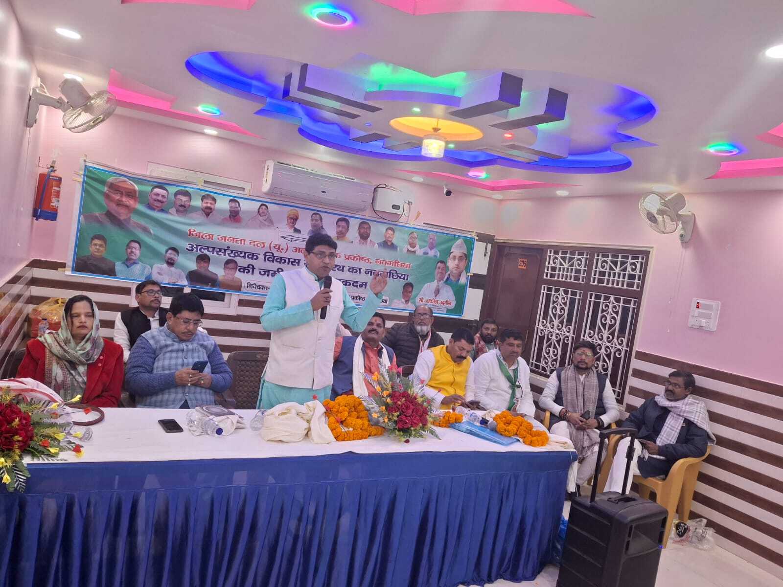 बिहार प्रदेश अल्पसंख्यक प्रकोष्ठ जदयू के तत्वावधान में अल्पसंख्यक विकास रथयात्रा पूरे प्रदेश में भ्रमण कर रही है.रथ नवगछिया के रंगरा चौक प्रखंड पहुंचा. अपराह्न चार बजे से स्टेशन रोड नवगछिया आनंद विवाह भवन हाल में जिलाध्यक्ष नवगछिया मो शकीलउद्दीन की अध्यक्षता में नवगछिया अल्पसंख्यक जिला कमेटी पदाधिकारी, प्रखंड अध्यक्ष, कार्यकर्ताओं व अल्पसंख्यक समाज के साथियों के साथ बैठक की. संचालन जिलाउपाध्यक्ष मो शाहिद रजा ने किया. बैठक कहकशां परवीन, अशरफ अंसारी साहब, मेजर इकबाल हैदर खान व त्रिपुरारी कुमार भारती मौजूद थे. प्रदेश अध्यक्ष अशरफ अंसारी ने कहा कि जिस प्रकार मुख्यमंत्री नीतीश कुमार ने मुसलमानों के लिए विकास का काम किया है, उस प्रकार मुसलमानों का वोट नीतीश कुमार को नहीं मिल पाया है. अल्पसंख्यक विकास यात्रा से अपनों के बीच जाकर इसी को बताया जा रहा है. अल्पसंख्यकों के विकास के लिए बिहार सरकार ने शिक्षा और रोजगार लोन के साथ-साथ बहुत सारी योजनाएं चलायी है. सभी बुनियादी समस्याओं को सुलझाया है. पूरे बिहार में 40 हजार वार्ड अध्यक्ष बनाना है और नीतीश कुमार के हाथ को मजबूत करना है. साथ चल रहे मेजर इकबाल हैदर खान ने कहा कि मुख्यमंत्री नीतीश कुमार ने कब्रिस्तान की घेराबंदी करके पूरे बिहार में तनाव के माहौल को खत्म किया है. जिलाध्यक्ष ने कहा कि हम संगठन के सभी साथियों के साथ मिल कर अल्पसंख्यकों के गांव-गांव और समाज के बीच जाकर नीतीश कुमार के मुसलमान के लिए किये गये कार्यों को गिनायेंगे और मुसलमानों का वोट जदयू को दिलायेंगे. बैठक में शबाना आजमी, कुमार मिलन सागर, अजीत कुमार पटेल, दिनेश पासवान, मो मंजूर आलम, गुलाम अली, मो फिरदौस, मो फारूक, मो ताजुद्दीन, मो मिस्टर, मो अमजद, मो अजदान, मो आकिब, शेख इश्तिहार, मो आरिफ, डॉ मो इस्लाम व सैकड़ों कार्यकर्ता मौजूद थे.
