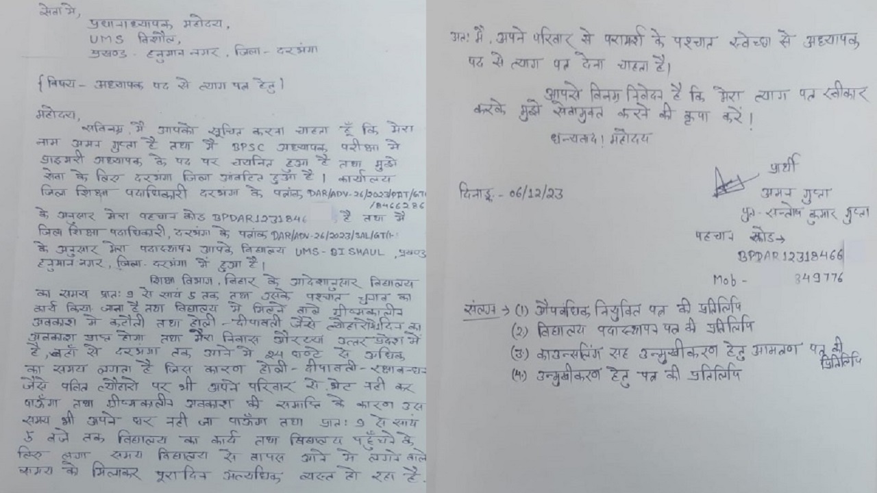दरभंगा के लहेरियासराय थाना क्षेत्र के राय साहब पोखर नवटोलिया निवासी अविनाश कुमार जो सिंघवारा प्रखंड के उच्च माध्यमिक विद्यालय मनीकौली में तैनात थे उन्होंने अपना इस्तीफा देते हुए कहा है कि झारखंड के न्यायालय में सहायक के पद नौकरी उनकी लगी है. उत्तर प्रदेश के मुजफ्फरनगर जिले की कृतिका ने बहेड़ी प्रखंड के मध्य विद्यालय सीरूआ से इस्तीफा दिया है. उन्होंने केंद्रीय विद्यालय में चयन हो जाने की बात कही है.