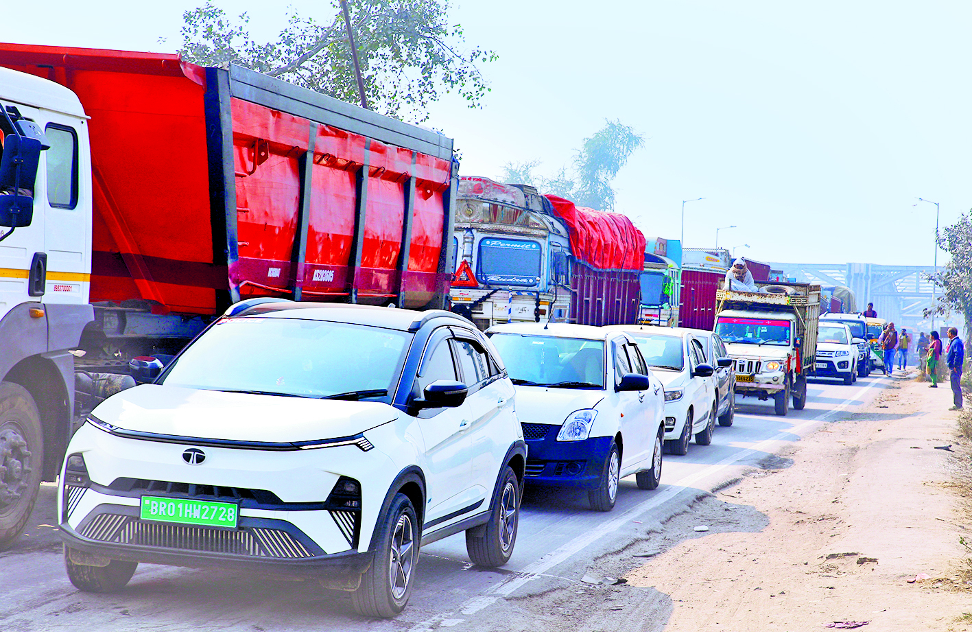 हाजीपुर. आज से करीब ढाई वर्ष पूर्व गांधी सेतु से होकर पटना जाना-आना काफी दुश्वारियों से भरा था, लेकिन जब गांधी सेतु के पूर्वी लेन पर भी परिचालन शुरू हुआ तो लोगों को महाजाम की समस्या से निजात मिल गयी. लोग फर्राटे से पटना जाने-आने लगे, लेकिन हाल के महीने में पटना की ओर विभिन्न परियोजनाओं के चल रहे निर्माण कार्य की वजह से गांधी सेतु पर जाम की समस्या एक बार फिर से गहरा गयी है. गांधी सेतु पर रोजाना लग रहे जाम की वजह से लोगों को न सिर्फ पटना जाने-आने में फजीहत झेलनी पड़ रही है, बल्कि हाजीपुर-पटना मार्ग से जुड़े अन्य एनएच व प्रमुख मार्ग भी जाम की चपेट में आ जा रहे हैं. सोमवार की देर शाम पटना जीरो माइल से शुरू हुआ जाम का सिलसिला मंगलवार की दोपहर तक जारी रहा. गांधी सेतु पर जाम का सीधा असर हाजीपुर-पटना मार्ग के अलावा हाजीपुर-छपरा, हाजीपुर-जंदाहा, हाजीपुर-मुजफ्फरपुर मार्ग के अलावा जढुआ के समीप हाजीपुर-महनार मार्ग पर भी दिखा. गांधी सेतु पर लगे भीषण जाम की वजह से हाजीपुर-मुजफ्फरपुर मार्ग पर एकारा गुमटी तक तथा हाजीपुर-छपरा मार्ग पर बीएसएनएल गोलंबर से नया गंडक पुल होते हुए सोनपुर तक वाहनों की लंबी कतार लग गयी थी. नया गंडक पुल पर लगे जाम की वजह से हाजीपुर-सोनपुर पुराना गंडक पुल पर भी मंगलवार की सुबह से भीषण जाम लग गया था. जाम के दौरान कई एंबुलेंस व स्कूली गाड़ियां भी फंसी रहीं.