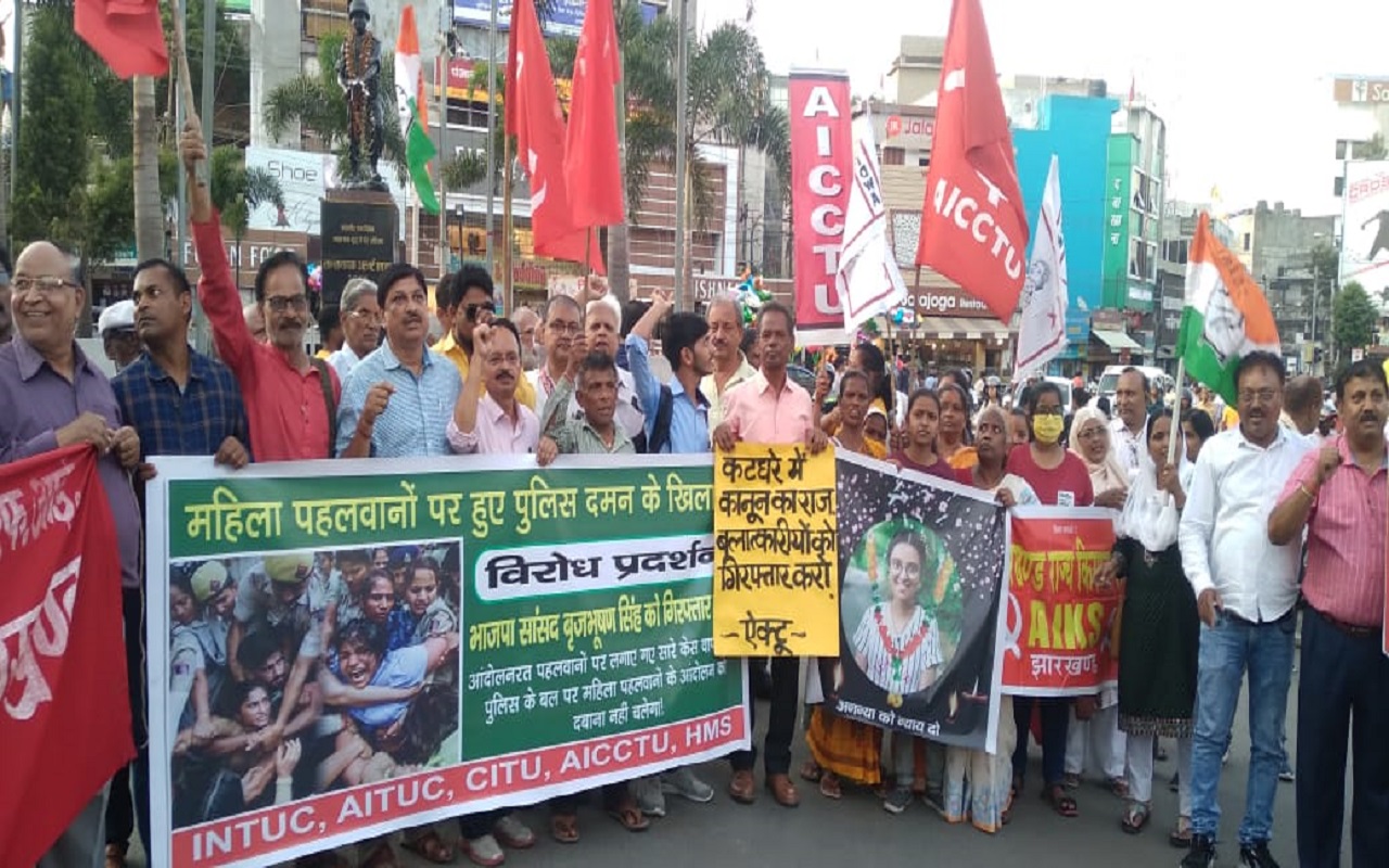 रांची: महिला कुश्ती खिलाड़ियों (पहलवानों) को न्याय दिलाने और भाजपा सांसद बृजभूषण शरण सिंह की गिरफ्तारी की मांग को लेकर आज गुरुवार को संयुक्त ट्रेड यूनियन ने रांची के अलबर्ट एक्का चौक पर विरोध प्रदर्शन किया. नेताओं ने केंद्र सरकार पर निशाना साधा और कहा कि महिला कुश्ती खिलाड़ियों को न्याय दिलाने तक आंदोलन जारी रहेगा.